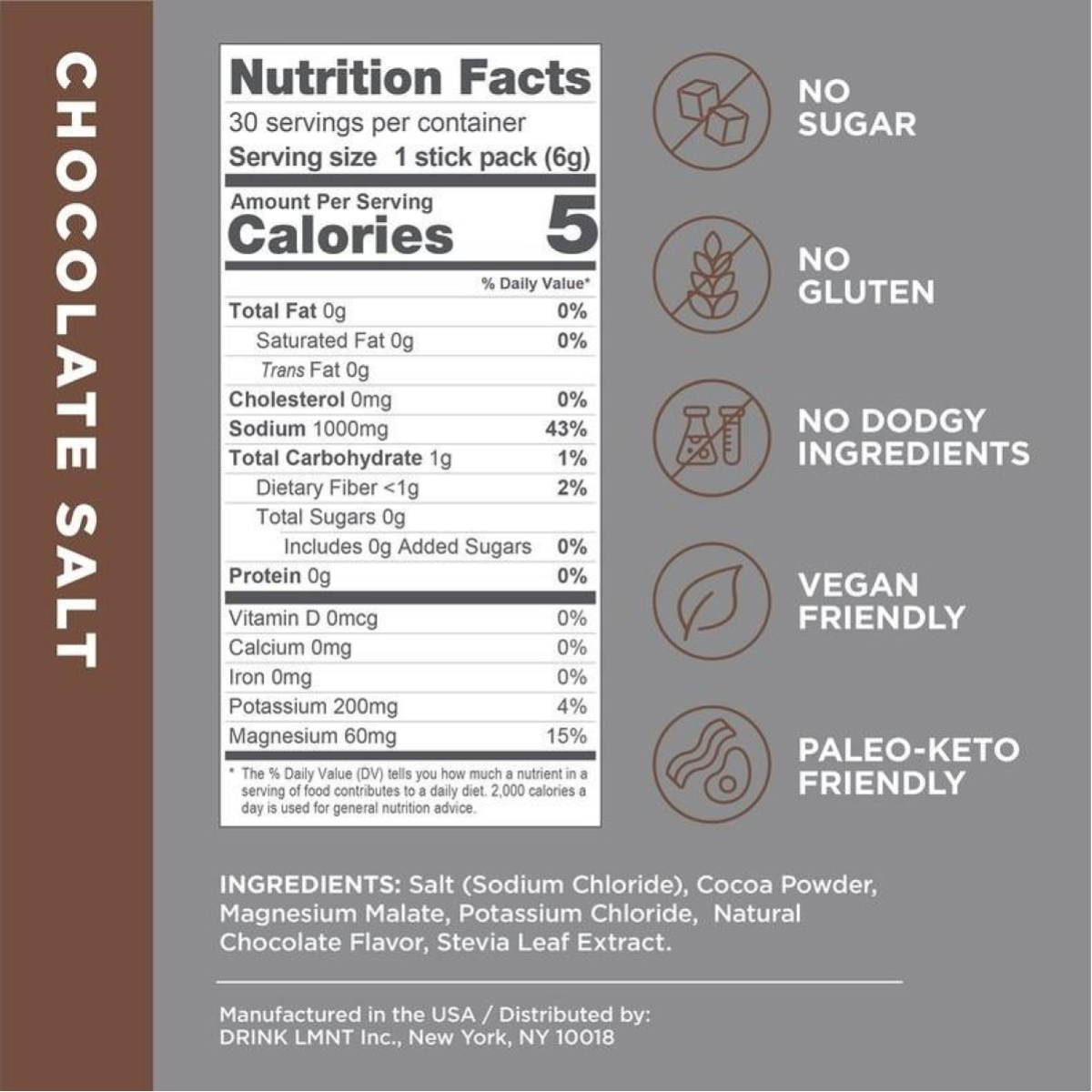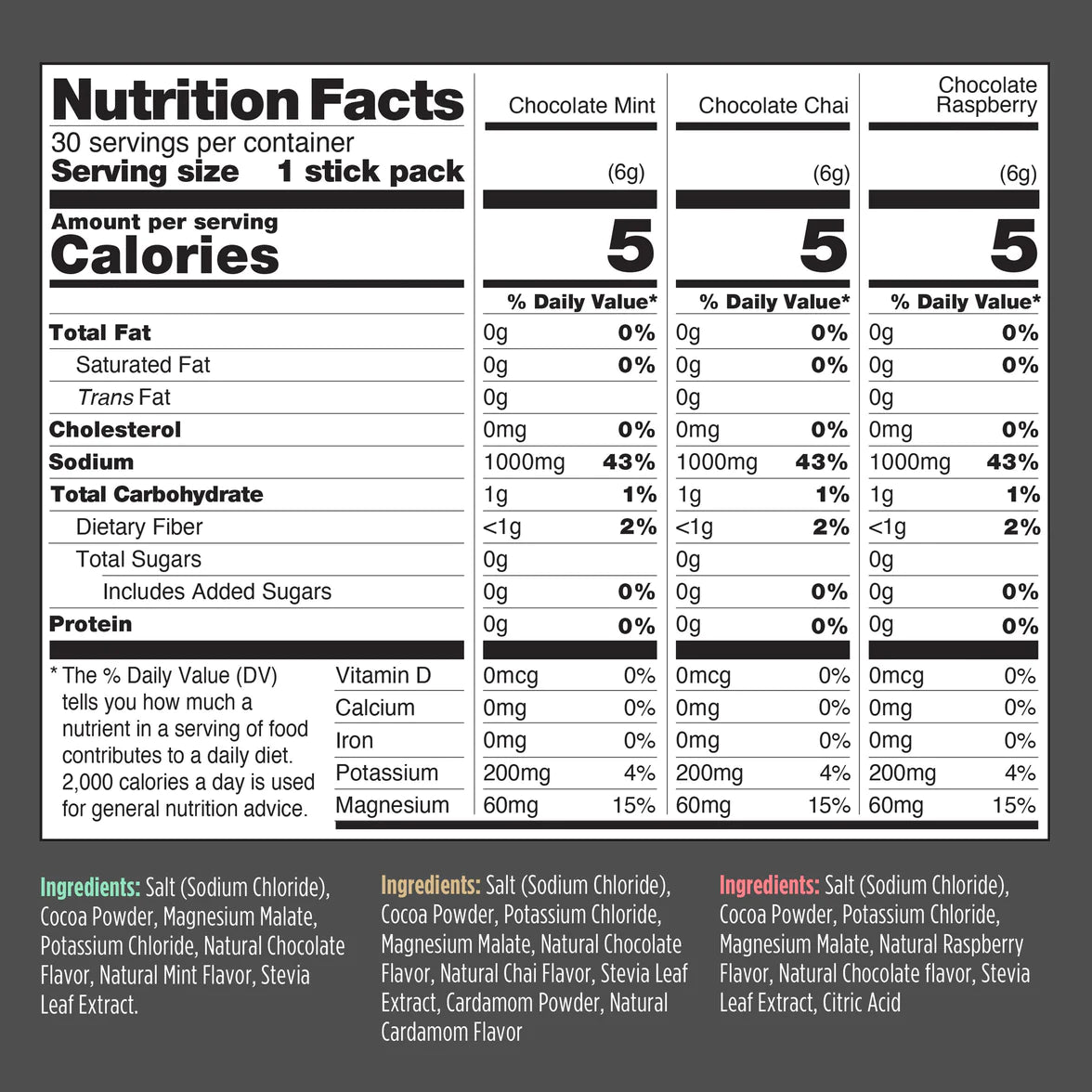 Chocolate Salt: Salt (Sodium Chloride), Cocoa Powder, Magnesium Malate, Potassium Chloride, Natural Chocolate Flavor (Natural Flavors (inc. Maltodextrin), Stevia Leaf Extract.