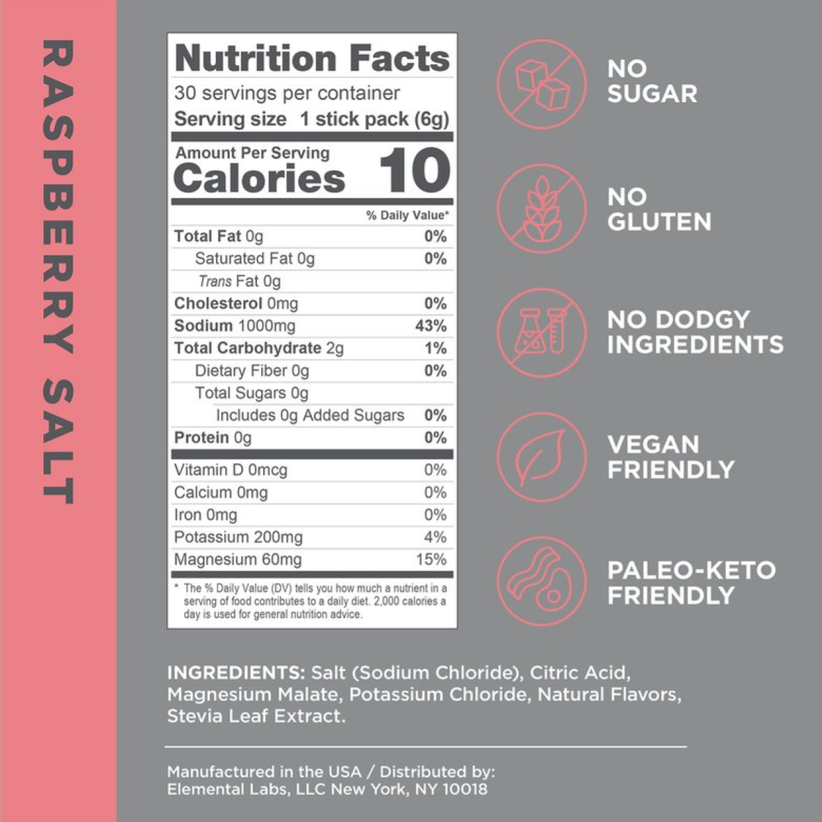 Raspberry Salt: Salt (Sodium Chloride), Citric Acid, Magnesium Malate, Potassium Chloride, Natural Flavors (inc. Maltodextrin), Stevia Leaf Extract.
