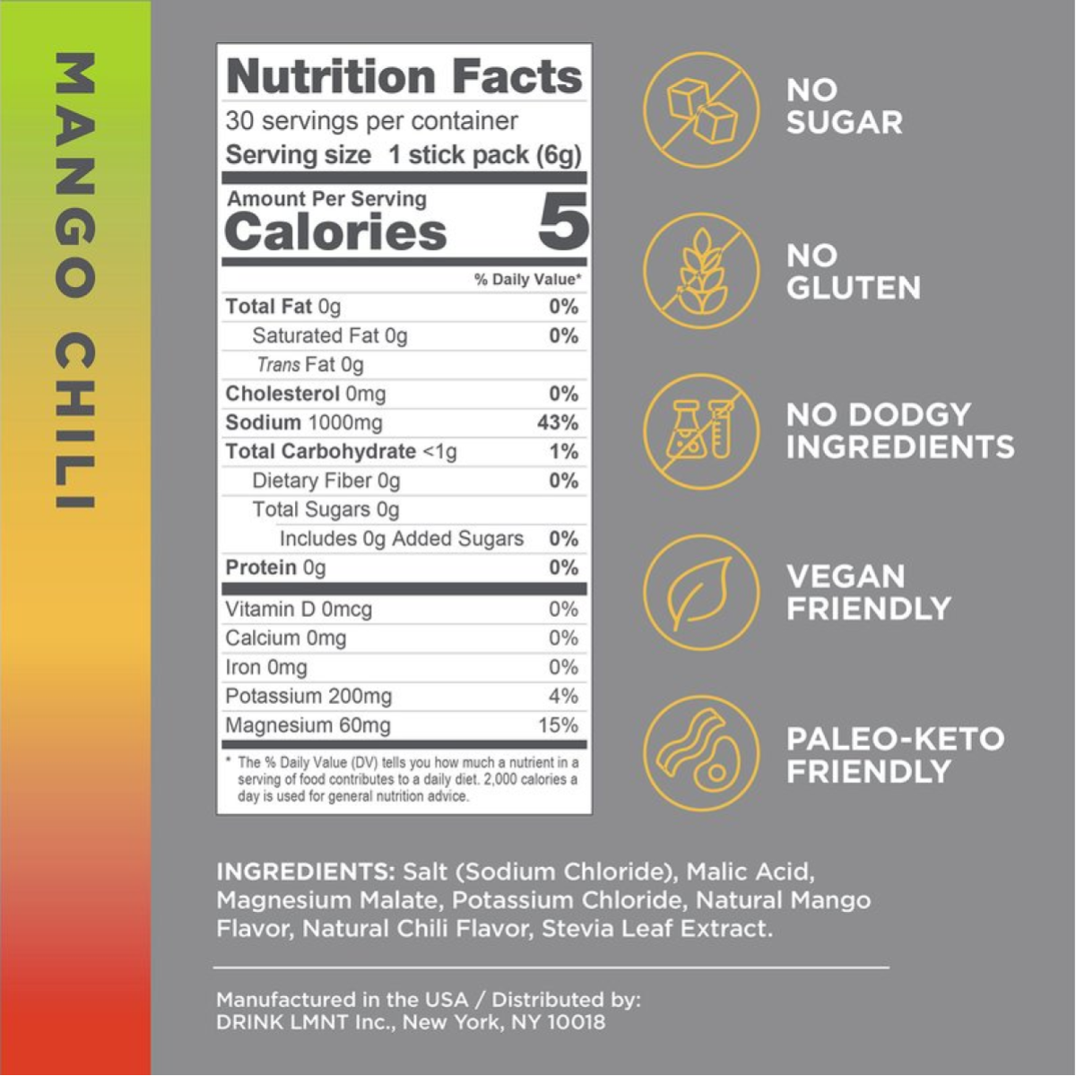 Mango Chili: Salt (Sodium Chloride), Malic Acid, Magnesium Malate, Potassium Chloride, Natural Mango Flavor (inc. Maltodextrin), Natural Chili Flavor, Stevia Leaf Extract.