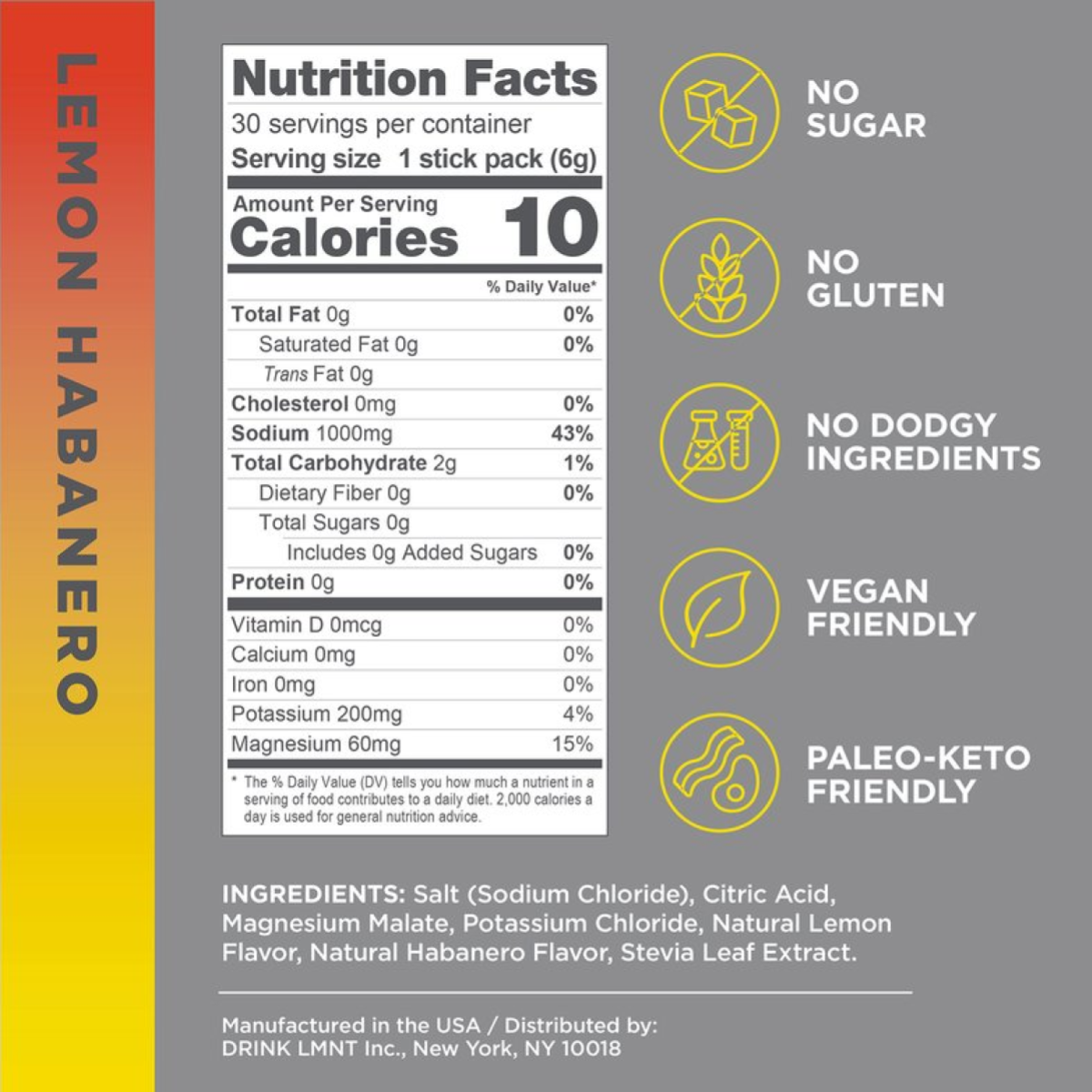 Lemon Habanero: Salt (Sodium Chloride), Citric Acid, Magnesium Malate, Potassium Chloride, Natural Lemon Flavor, Natural Habanero Flavor (Natural Flavors (inc. Maltodextrin), Stevia Leaf Extract.