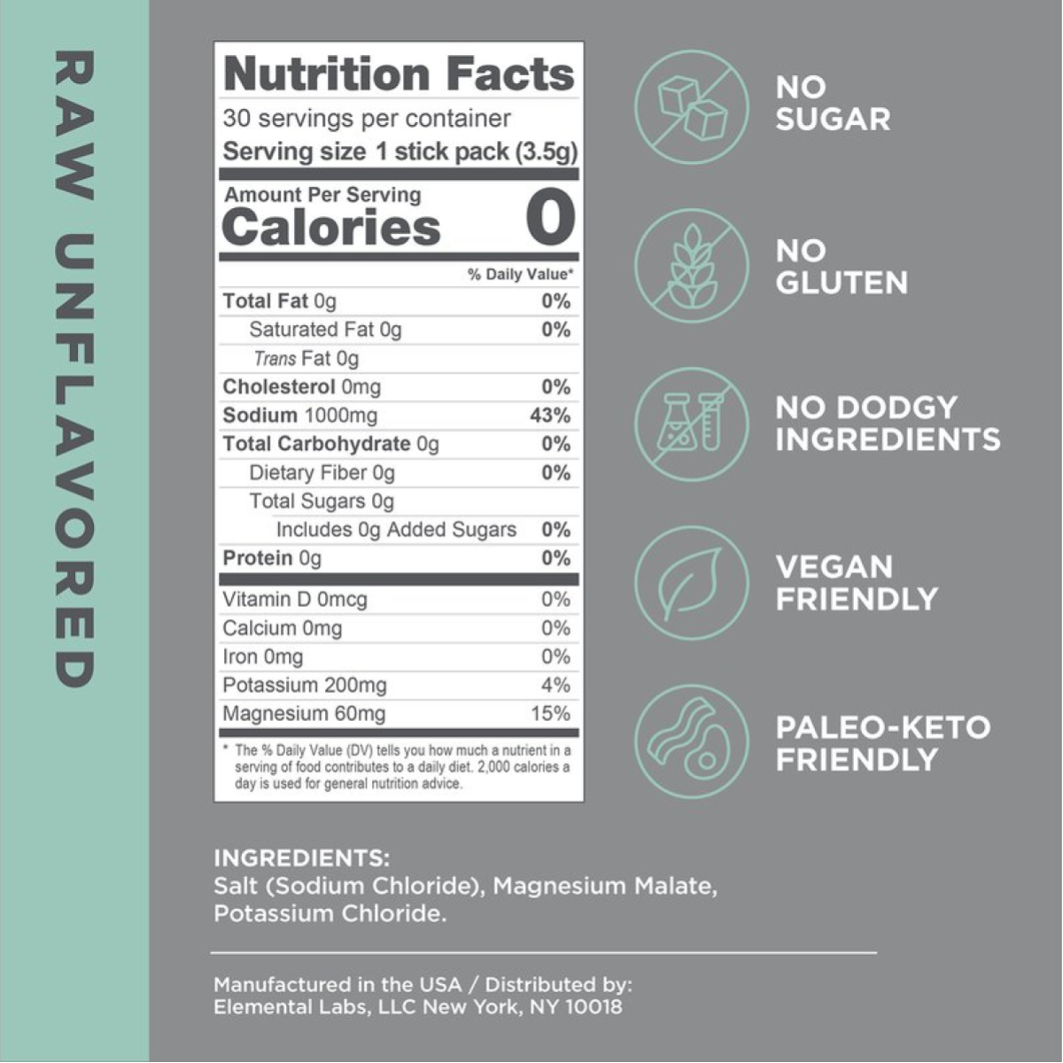 Raw Unflavored: Salt (Sodium Chloride), Magnesium Malate, Potassium Chloride.