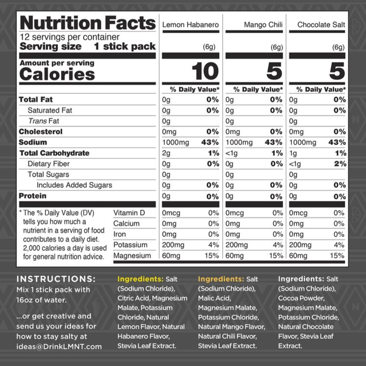 You can find a full list of ingredients and nutrition facts panels for every flavor of LMNT by visiting our webstore and scrolling through the product images.