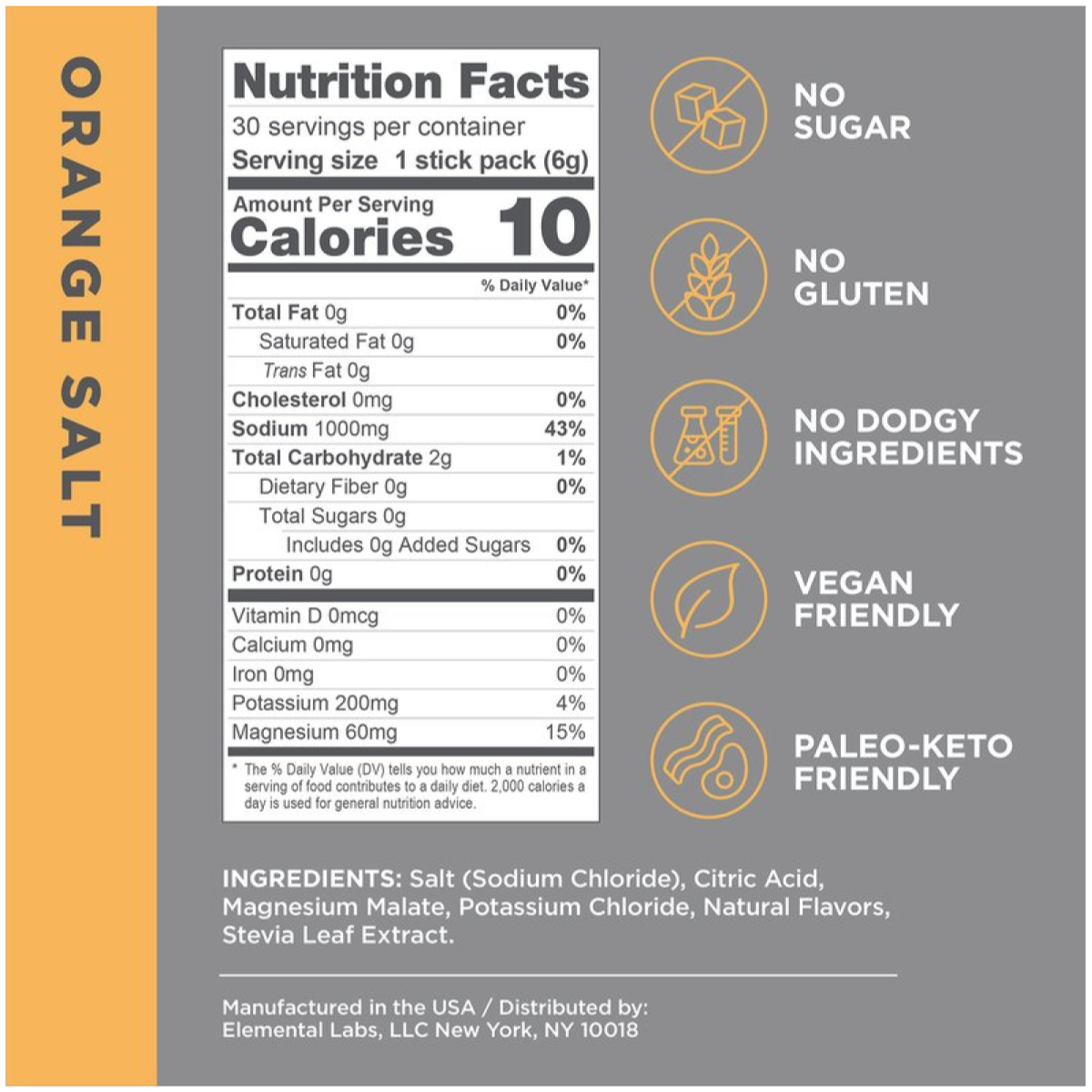 Orange Salt: Salt (Sodium Chloride), Citric Acid, Magnesium Malate, Potassium Chloride, Natural Flavors (inc. Maltodextrin), Stevia Leaf Extract.