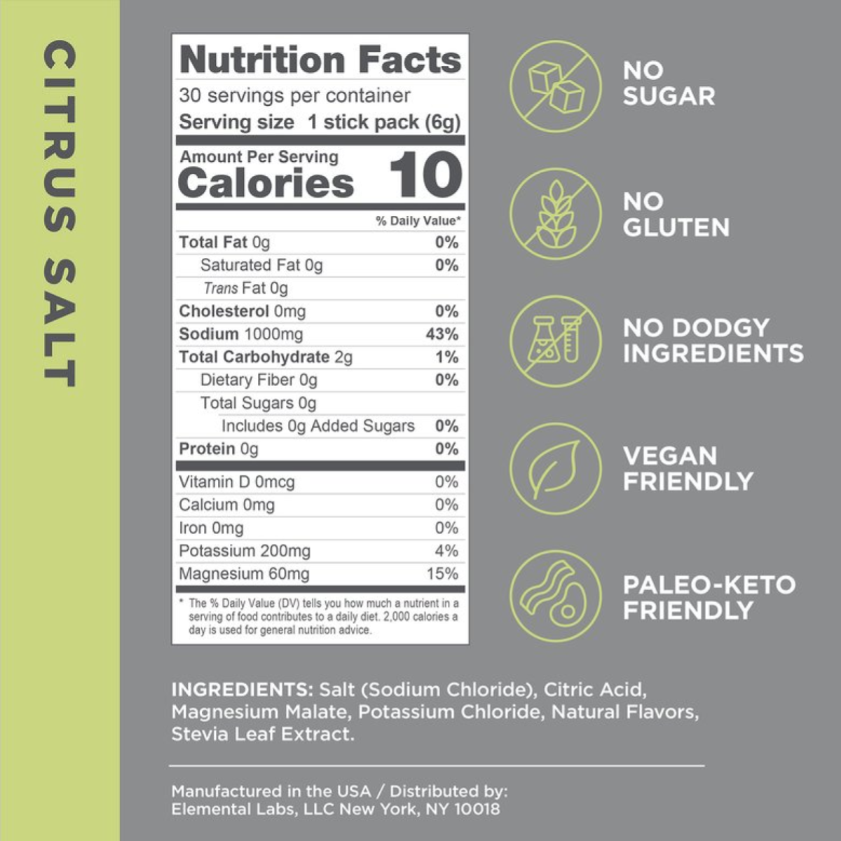 Citrus Salt: Salt (Sodium Chloride), Citric Acid, Magnesium Malate, Potassium Chloride, Natural Flavors (inc. Maltodextrin), Stevia Leaf Extract.