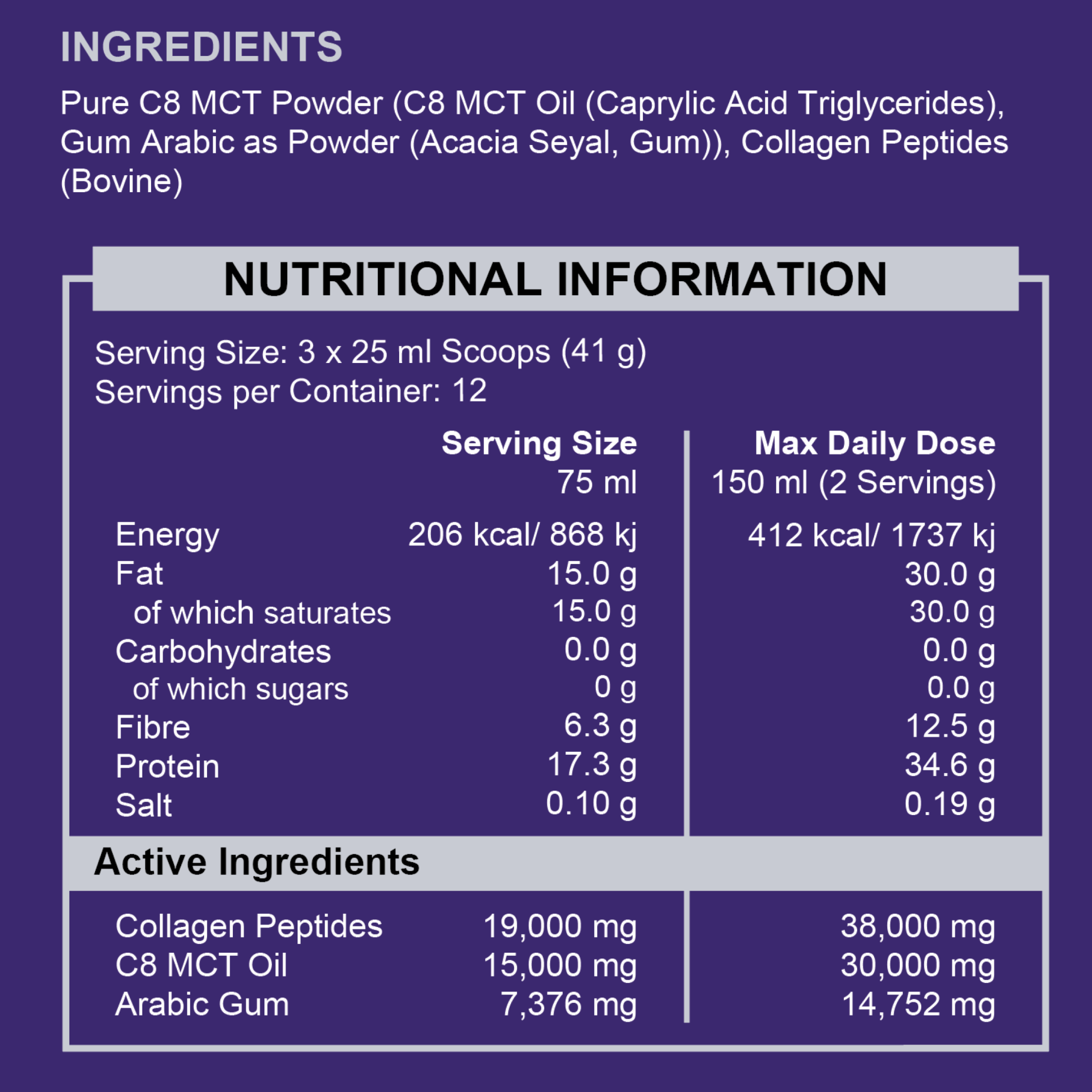 C8 MCT Oil (Caprylic Acid Triglyceride), Acacia Fibre and Collagen Peptides.◉ Full Transparency