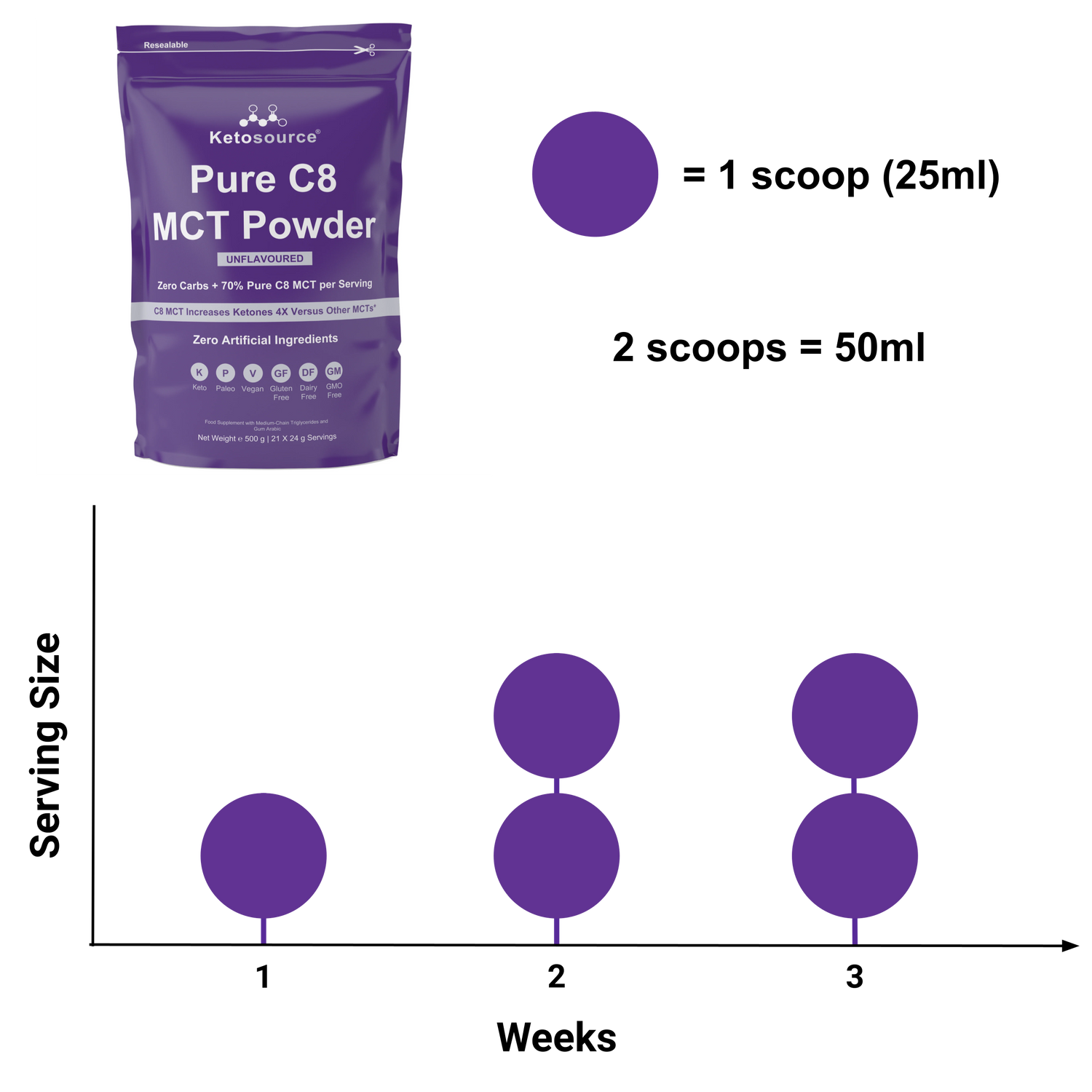 ◉ You can take C8 MCT Powder three times a day to boost ketones and get you into dietary ketosis
