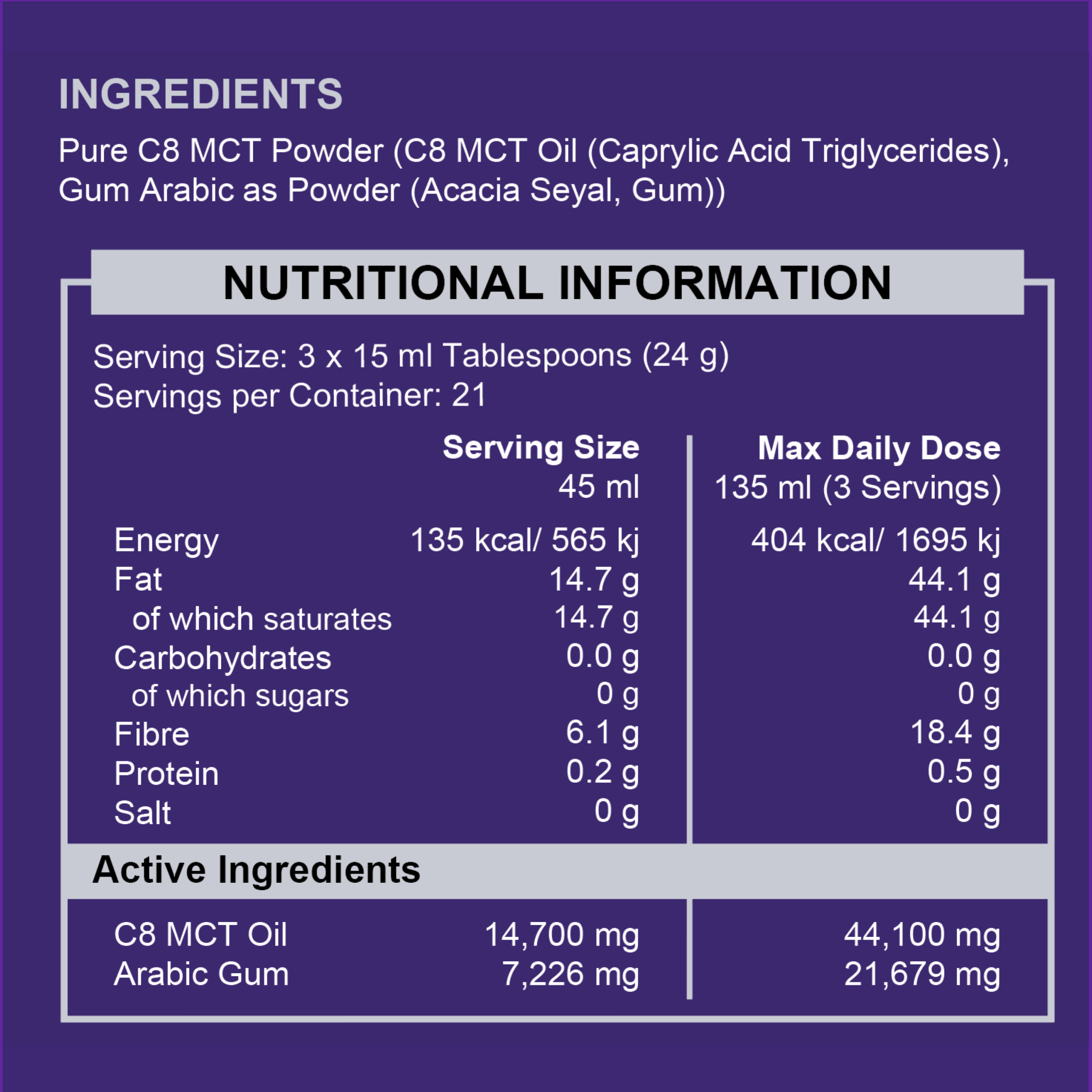 The Pure C8 MCT Powder contains: C8 MCT Oil (Caprylic Acid Triglycerides), Gum Arabic as Powder (Acacia Seyal, Gum), Cocoa Powder (Alkalized), Steviol Glycosides (Natural Sweetener).