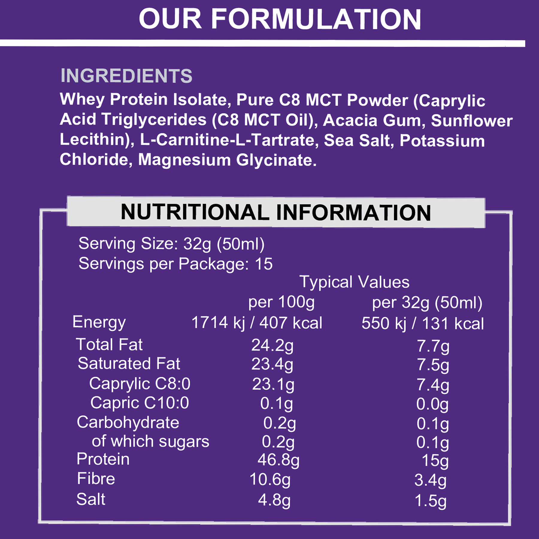 Whey Protein Isolate, Pure C8 MCT Powder (CaprylicAcid Triglycerides (C8 MCT Oil), Acacia Gum, SunflowerLecithin), L-Carnitine-L-Tartrate, Sea Salt, PotassiumChloride, Magnesium Glycinate.