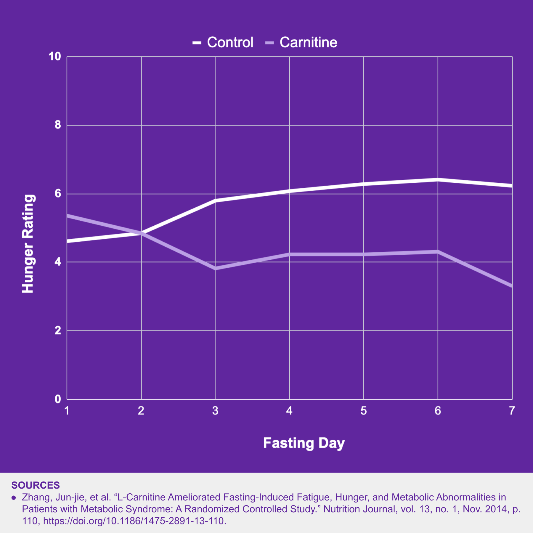 ⦿ Second, you have carnitine. Carnitine has been shown in the research to be remarkably effective at reducing hunger in people while they are fasting (see chart).